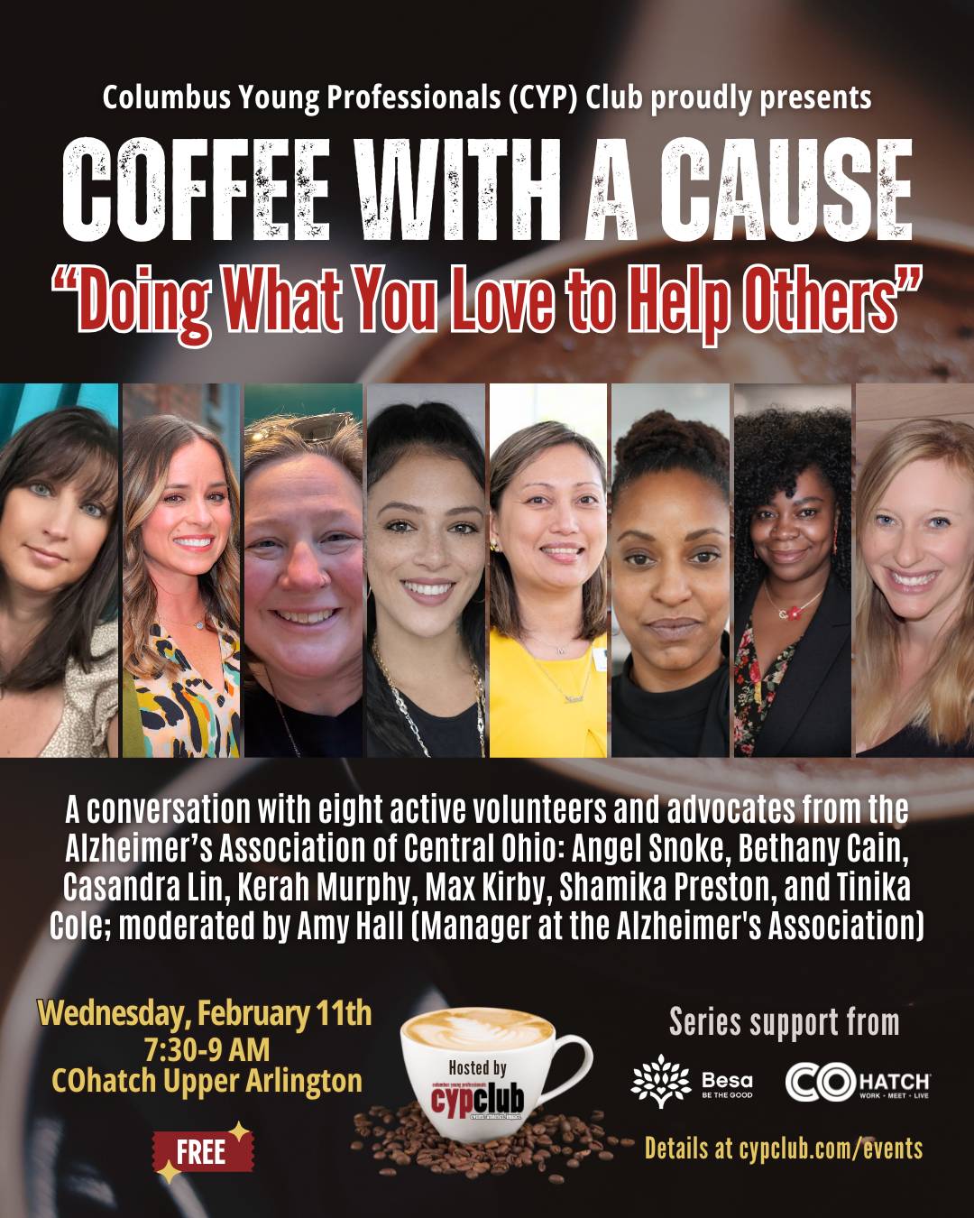 Start your day with purpose at Coffee with a Cause: Doing What You Love to Help Others, a thoughtful conversation on turning passion into impact with eight active volunteers and advocates representing the Alzheimer’s Association of Central Ohio, including Angel Snoke, Bethany Cain, Casandra Lin, Kerah Murphy, Max Kirby, Shamika Preston, and Tinika Cole. Moderated by Amy Hall, Manager at the Alzheimer’s Association, this morning gathering includes complimentary coffee and bagels and is free to attend, thanks to our partners at COhatch!