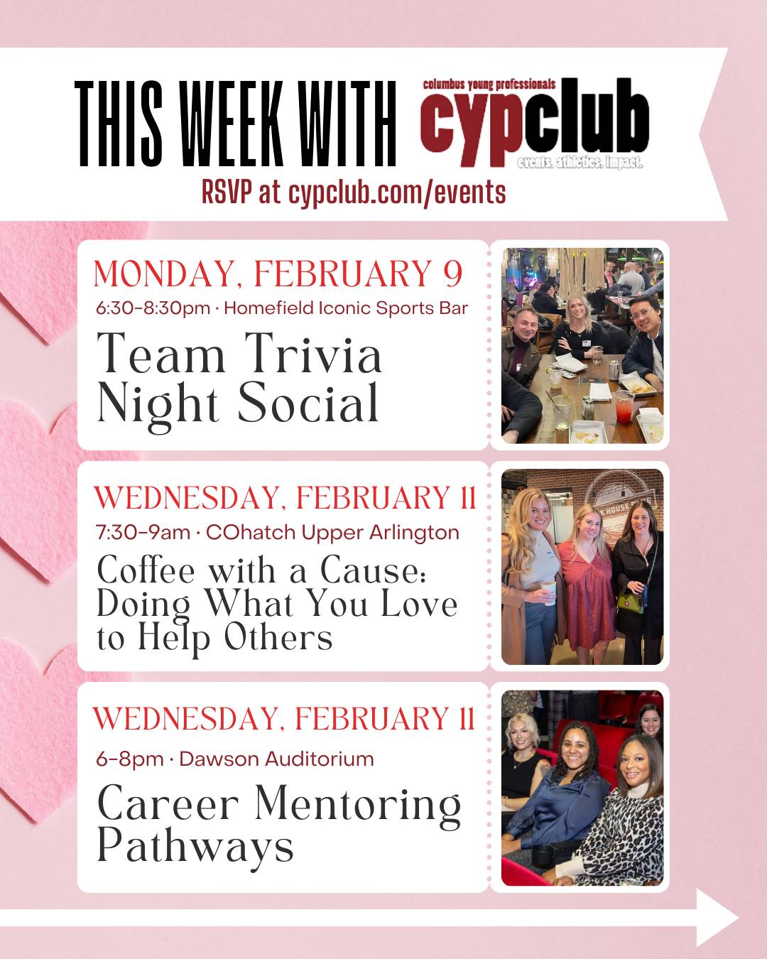 Kick things off with Team Trivia Night on Monday (Feb. 9), then bookend your Wednesday (Feb. 11) with two impactful career and community conversations; Coffee with a Cause at COhatch UA in the morning (7:30-9am), and Career Mentoring Pathways at Dawson in the evening (6-8pm). Think of it as a midweek reset: connect, learn, and walk away with ideas you can actually use.